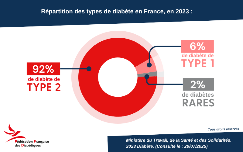 Il existe différents types de diabète, le diabète de type 2 avec 92 % des cas et le diabète de type 1 avec 6 % des cas. Ces deux types de diabète sont prédominants. Les autres types de diabète concernent des formes plus rares et représentent les 2 % restants (diabète gestationnel, MODY, LADA ou diabète secondaire à certaines maladies ou prises de médicaments).3