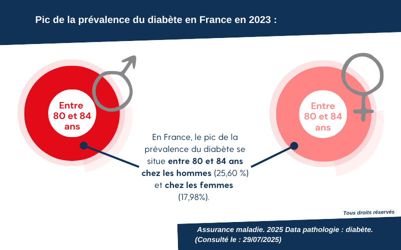En France, le pic de la prévalence du diabète se situe entre 80 et 84 ans chez les hommes (25,60 %) et chez les femmes (17,98 %)1. Cette tendance s'inscrit dans le contexte mondial, où la prévalence du diabète chez les personnes de plus de 75 ans est influencée principalement par deux facteurs clés : l'augmentation de l'incidence du diabète et l'accroissement régulier de l'espérance de vie.