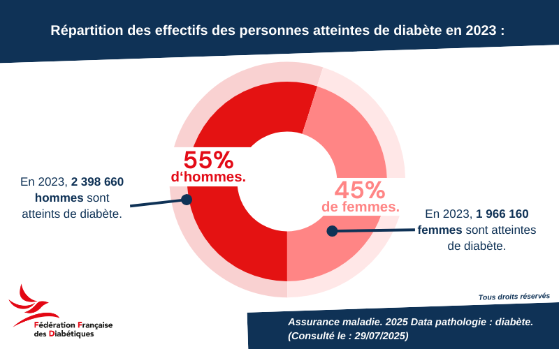 De plus, le diabète touche principalement les hommes avec 55 % contre 45 % de femmes.1 Dans les départements et régions d’outre-mer (DROM), cette tendance s’inverse : les femmes sont davantage touchées en Guadeloupe (59 %), en Martinique (59 %), en Guyane (57 %) et à La Réunion (54 %) en 2021.5