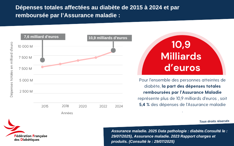 Si le diabète continue de progresser en France, son coût augmente également. En 2023, la somme des dépenses totales affectées au diabète et remboursées par l’Assurance maladie s'élève à plus de 10 milliards d’euros. 1