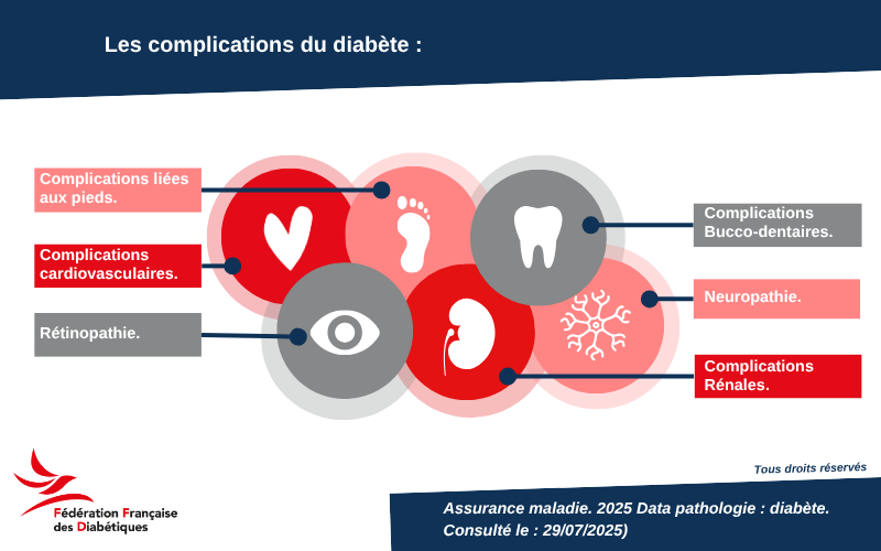 Lorsque l’on est atteint de diabète, des complications peuvent survenir en raison de l'incapacité du corps à réguler le taux de sucre dans le sang. Les excès de sucre permanents (hyperglycémies chroniques) abîment au fil du temps les parois des gros et des petits vaisseaux sanguins, ce qui affecte aussi les organes qu’ils irriguent. Les nerfs peuvent également être touchés. Si le diabète n’est pas ou mal équilibré, des complications peuvent survenir et toucher les organes.