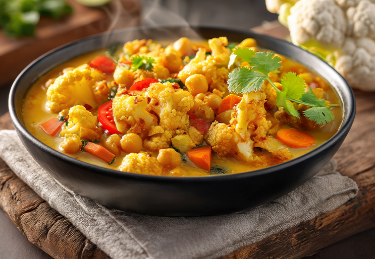 Cette recette met à l’honneur des légumes, qui peuvent être variés selon vos envies et les saisons. Ils apportent tous des vitamines, des antioxydants et des fibres. Le chou-fleur contient seulement 2 % de glucides (autant que de fibres) et 93 % d’eau ce qui en fait un allié de choix pour éviter le pic de glycémie après le repas et contribuer à l’hydratation. Ce plat peut donc être consommé au déjeuner ou au diner.