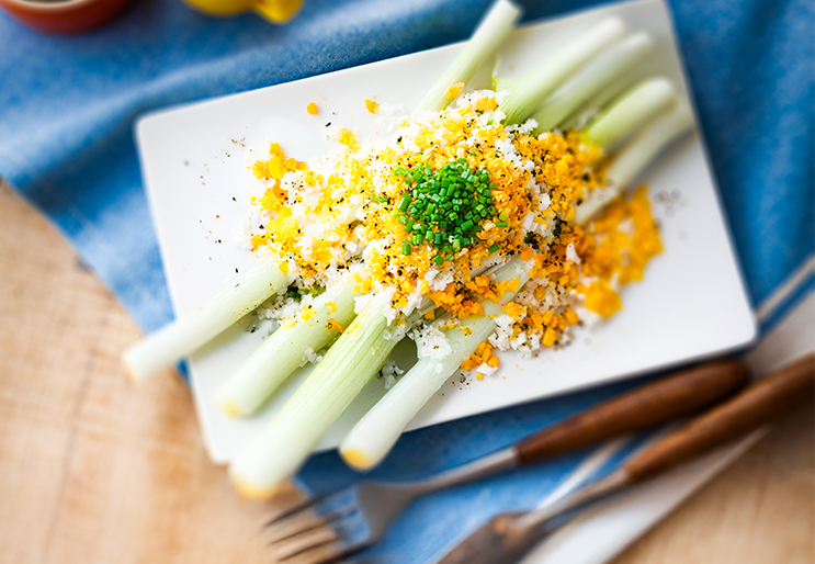 Égoutter les poireaux et les œufs séparément, les passer sous l’eau froide et réserver les poireaux.