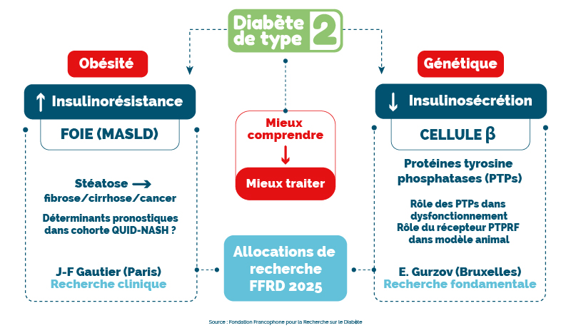 En 2025, deux projets de recherche ont été sélectionnés par la FFRD, ciblant deux anomalies-clé du diabète de type 2 :