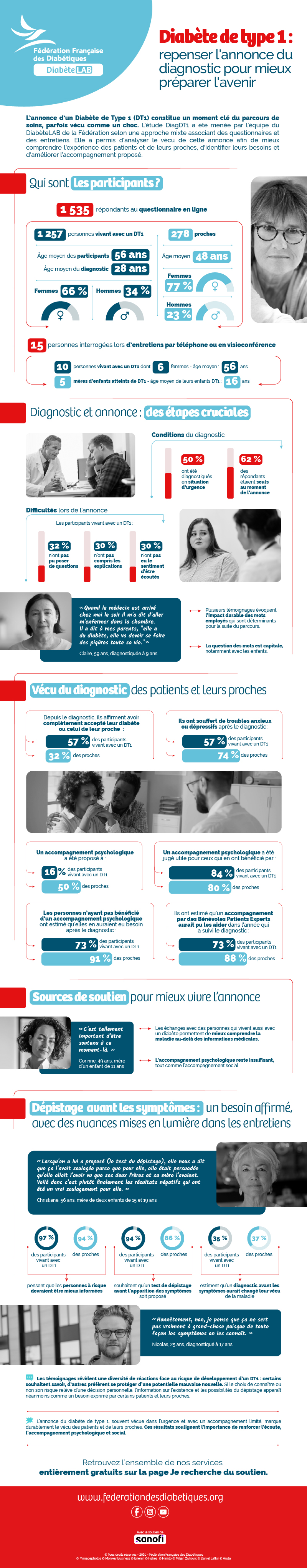 Le Diabète LAB de la Fédération a mené l’étude DiagDT1, avec le soutien du laboratoire Sanofi. Cette étude s’intéresse à l’annonce du diagnostic d’un diabète de type 1 en donnant la parole aux personnes directement concernées : près de 1532 personnes dont 1257 vivants avec un diabète de type 1 et 278 proches ont ainsi répondu à un questionnaire en ligne. Par ailleurs, 15 autres personnes ont été interrogées lors d’un entretien individuel avec un membre de l’équipe du Diabète LAB.