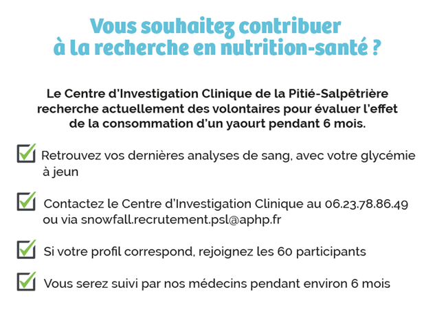 L’étude Snowfall menée par l’équipe du Pr Karine Clément est en cours de préparation avec un objectif clair : comparer l’effet de la consommation quotidienne de deux portions de yaourt par rapport à du lait pendant 6 mois sur la régulation de la glycémie, chez soixante personnes en surpoids ou en obésité modérée avec un prédiabète.